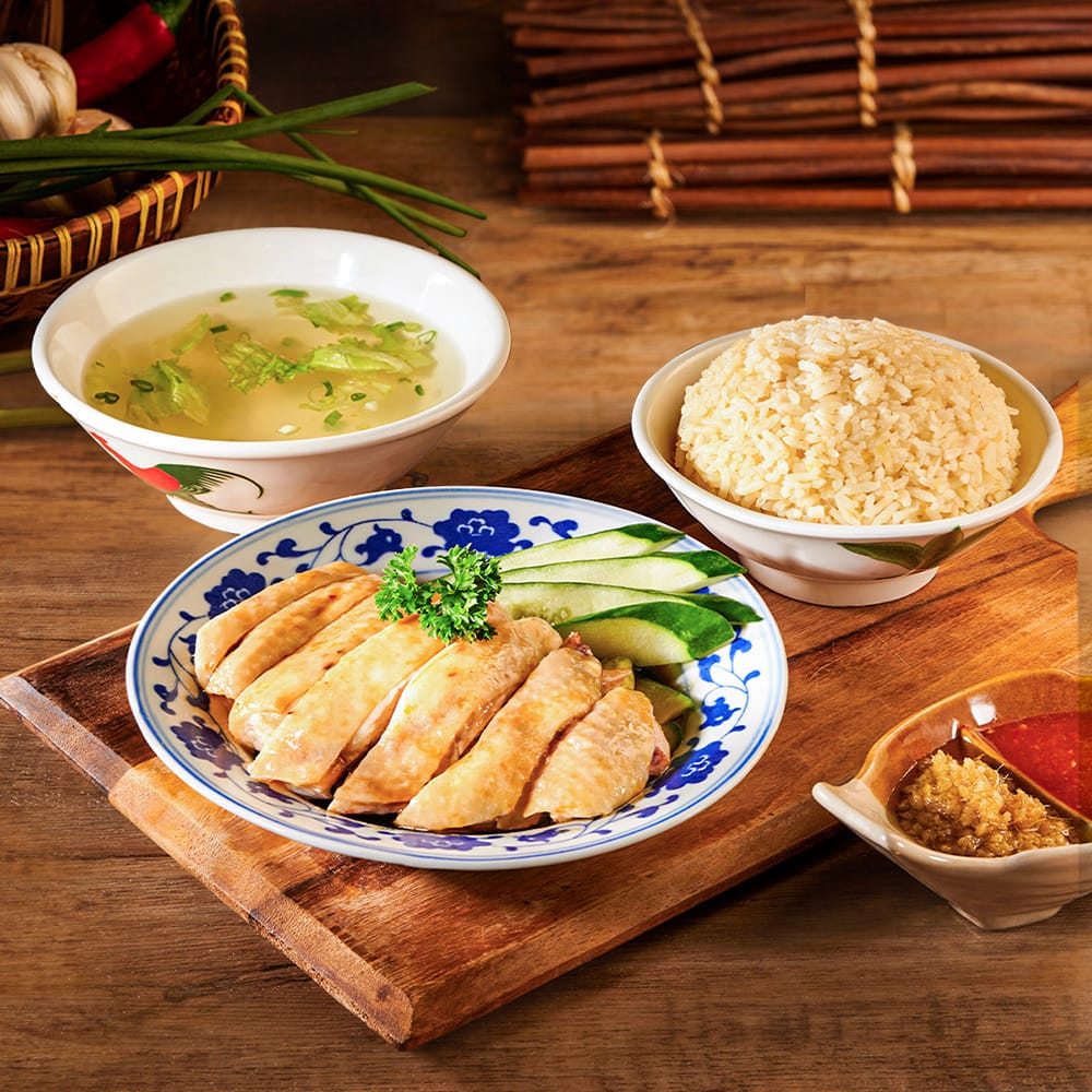Hainanese Chicken Rice — Tender poached chicken served with fragrant rice cooked in chicken stock, accompanied by the essential trio of ginger paste, chili sauce, and dark soy sauce. A comforting classic executed with authenticity.