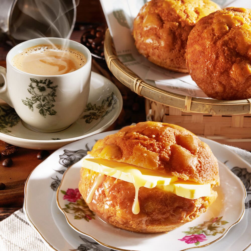 Polo Bun with Condensed Milk — A beloved Hainanese classic featuring a sweet, crumbly cookie-like topping over soft bread, generously filled with creamy condensed milk. This signature item showcases the chef’s colonial-era influenced baking expertise.