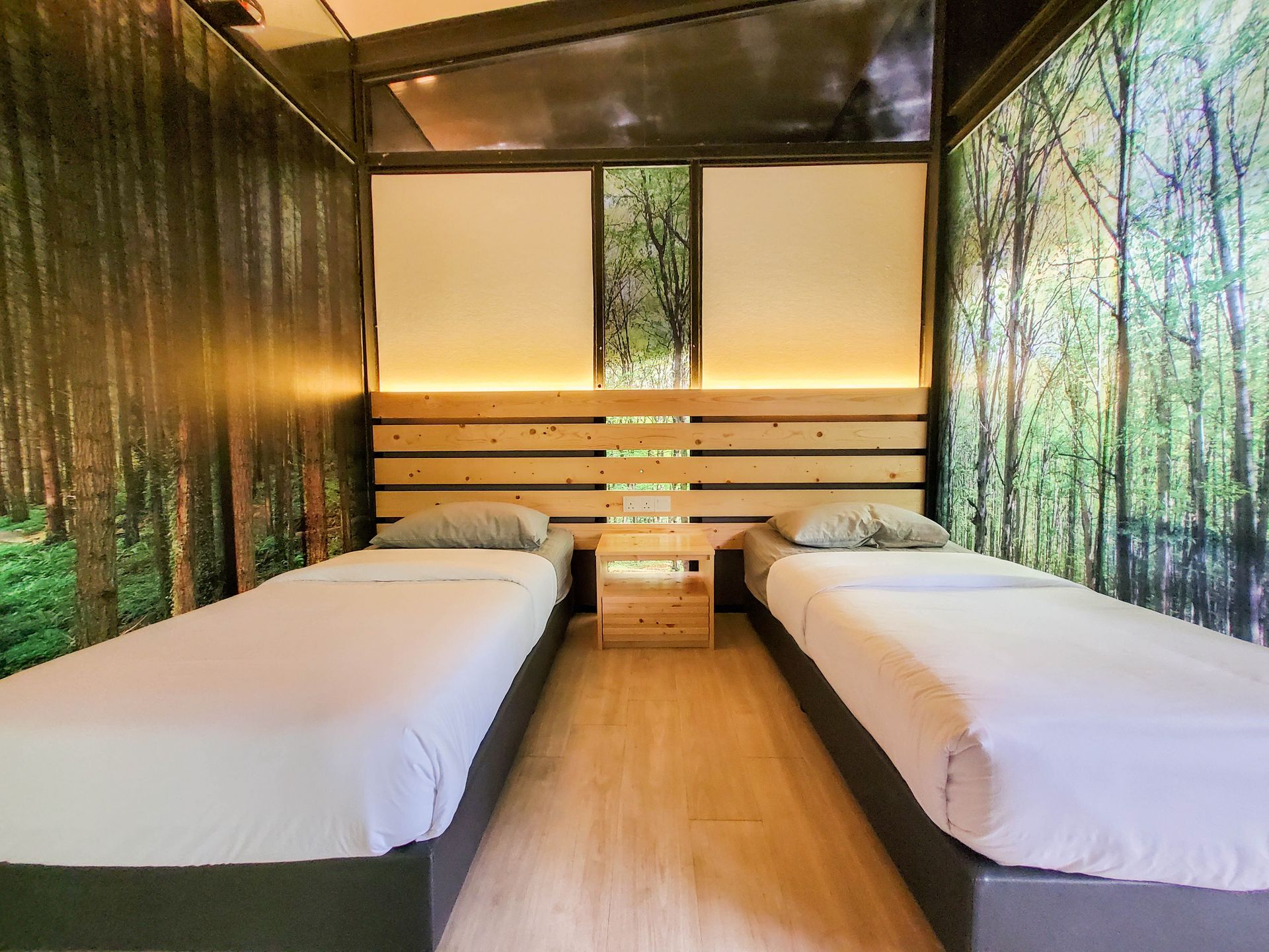 Experience luxury in nature with glamping at X Park featuring modern square huts for 2. The glamping experience includes cube rooms with modern amenities.