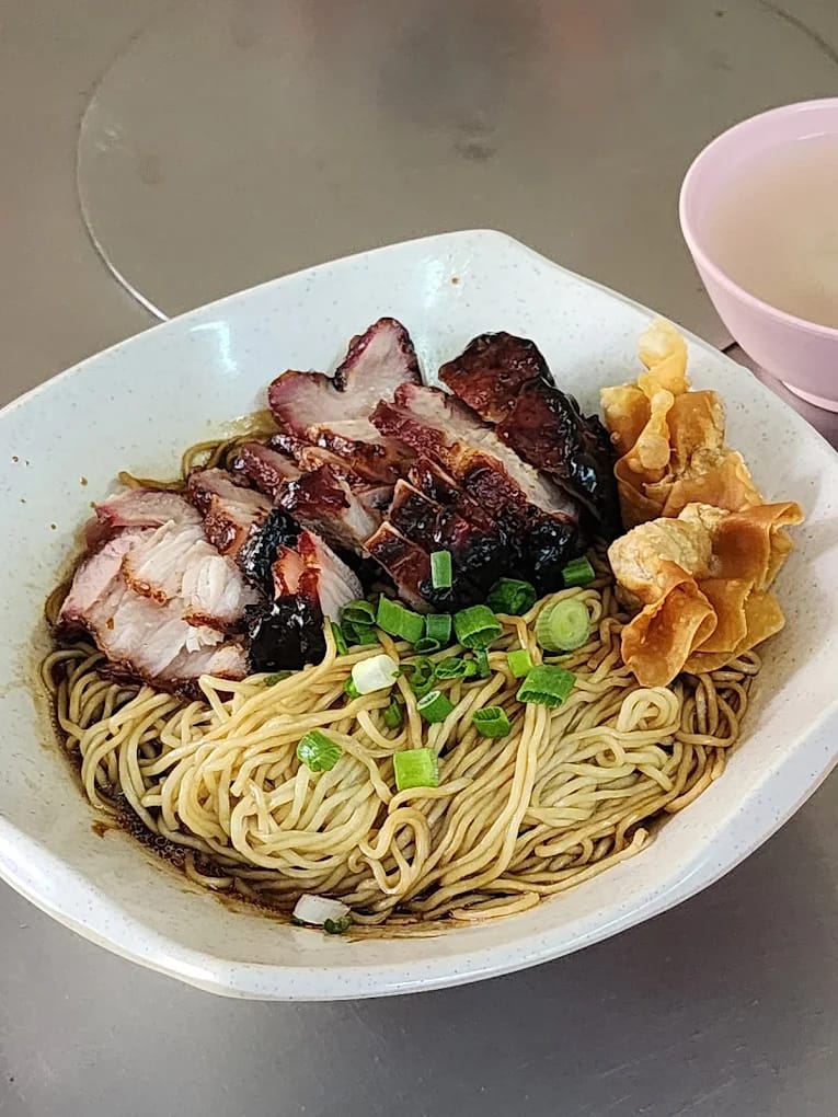 The result is char siew with crispy, caramelized edges and a glistening honey glaze. When you bite into it, the fat renders immediately, coating your mouth with sweet, smoky flavors. It's served in generous slices over the same handmade noodles, creating the perfect harmony of textures and flavors.